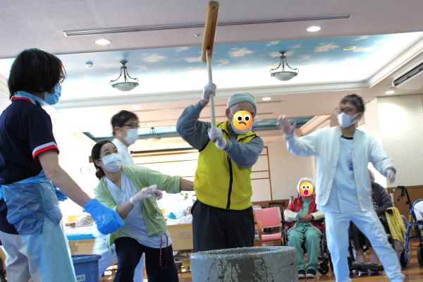 毎年、餅つきをするのは職員で、利用者の方には『よいしょー!』と元気なかけ声を